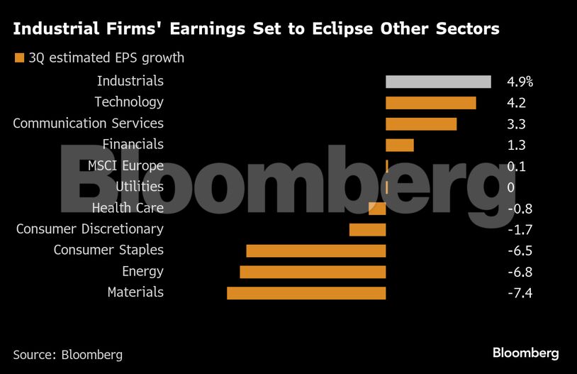 Σύμφωνα με τα στοιχεία του Bloomberg, ο δείκτης MSCI Europe Industrials εκτιμάται ότι θα εμφανίσει αύξηση κερδών ανά μετοχή (EPS) κατά 4,9% για το τρίτο τρίμηνο, την υψηλότερη επίδοση μεταξύ όλων των κλάδων της περιοχής.
