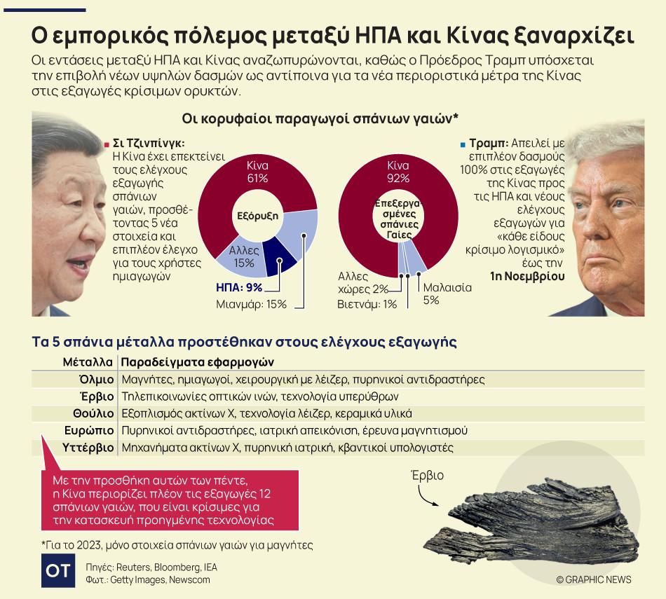 Με τις τελευταίες προσθήκες – όλμιο, έρβιο, θούλιο, ευρώπιο και υττέρβιο – οι εξαγωγές 12 σπάνιων γαιών περιορίζονται πλέον, βαθαίνοντας την αντιπαράθεση μεταξύ των δύο μεγαλύτερων οικονομιών του κόσμου.