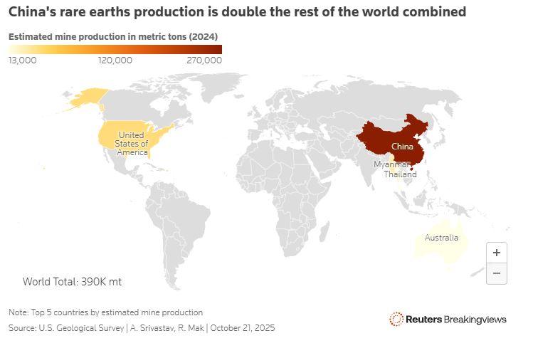 Η δεύτερη μεγαλύτερη οικονομία στον κόσμο παράγει πάνω από το 90% των παγκόσμιων επεξεργασμένων σπάνιων γαιών και μαγνητών σπάνιων γαιών, οι οποίοι είναι ζωτικής σημασίας για ηλεκτρικά οχήματα, ηλεκτρονικά, πυραύλους ακριβείας και άλλα. Είναι μια μικρή αγορά, με συνολική παραγωγή το 2024 μόλις 6,5 δισεκατομμύρια δολάρια, εκτιμούν οι αναλυτές της Goldman Sachs. Ωστόσο, δεδομένης της σημασίας της σε τόσους πολλούς κλάδους, η τράπεζα υπολογίζει ότι μόνο μια αναστάτωση 10% σε αυτούς τους τομείς θα μπορούσε να οδηγήσει σε απώλεια παραγωγής 150 δισεκατομμυρίων δολαρίων.
