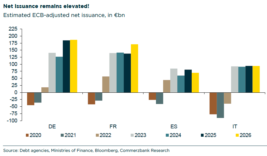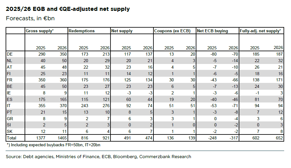 Η Commerzbank επισημαίνει ότι η καθαρή προσφορά, προσαρμοσμένη για την ΕΚΤ, θα φτάσει σε νέο υψηλό, κοντά στα 652 δισ., καθώς οι επαναγορές ομολόγων που διακρατούνται από το χαρτοφυλάκιο της ΕΚΤ θα είναι ιστορικά αυξημένες, αγγίζοντας τα 317 δισ., με τη Γαλλία και την Ιταλία να ηγούνται των αποπληρωμών.