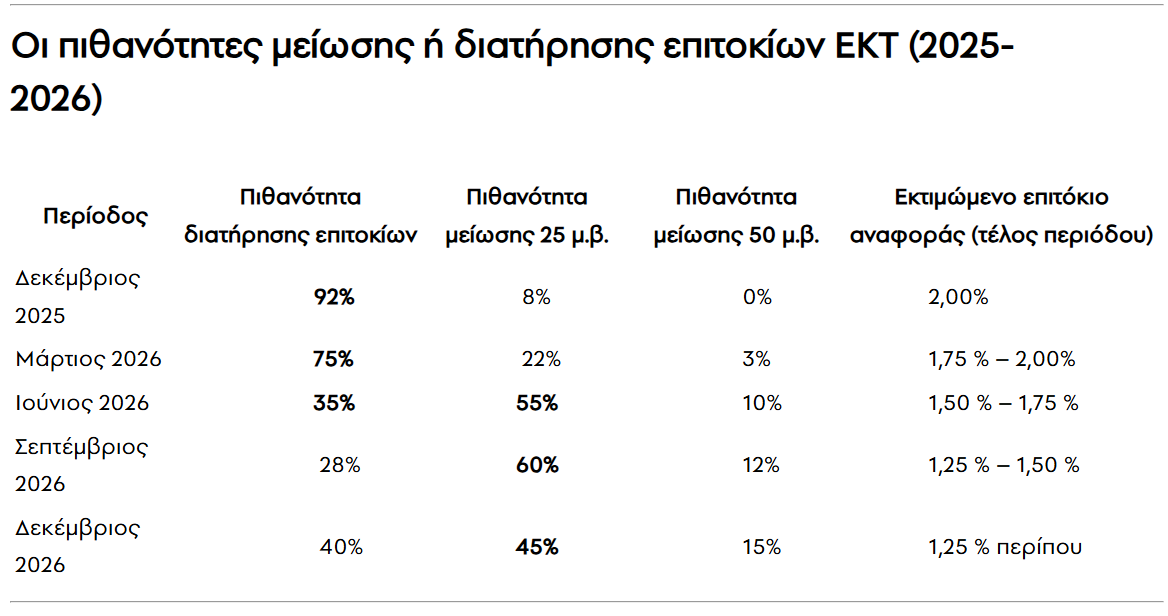 Η αγορά επίσης, προεξοφλεί ότι ο ρυθμός αποκλιμάκωσης θα είναι εξαιρετικά σταδιακός, με το επιτόκιο αναφοράς να κινείται κοντά στο 1,25 % στα τέλη 2026 — μακριά από την «άμεση χαλάρωση» που είχαν προβλέψει ορισμένοι επενδυτές στις αρχές του 2025.