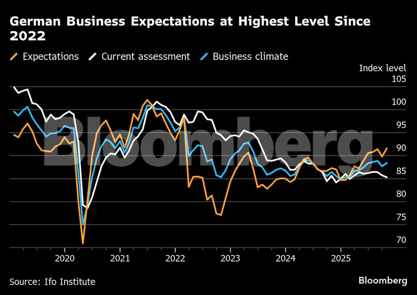 Σύμφωνα με το Ινστιτούτο Ifo, ο δείκτης προσδοκιών των επιχειρήσεων ανήλθε τον Οκτώβριο στις 91,6 μονάδες από 89,8 τον Σεπτέμβριο – το υψηλότερο επίπεδο από το 2022 και πάνω από τη μέση εκτίμηση των αναλυτών (90 μονάδες). Ωστόσο, ο δείκτης τρέχουσας συγκυρίας εμφάνισε μικρή πτώση, δείχνοντας ότι η ανάκαμψη δεν έχει ακόμη παγιωθεί.