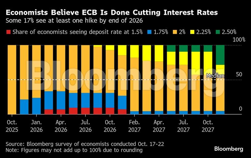 Θα διατηρήσει τα επιτόκια στο 2% για τρίτη συνεχόμενη συνεδρίαση. Δεν έχουν αλλάξει πολλά από τον Σεπτέμβριο, όταν οι υπεύθυνοι χάραξης πολιτικής δήλωσαν ότι η οικονομία της Ευρωζώνης παρέμεινε σε «καλή θέση». Δεν έχουν ακόμη δει τον πλήρη αντίκτυπο των αμερικανικών δασμών και το ευρώ, του οποίου η αύξηση κατά 12% φέτος μπορεί να μειώσει τον πληθωρισμό». «Αυτή είναι απλώς μια ενδιάμεση συνάντηση. Η πιο σημαντική θα πραγματοποιηθεί στα μέσα Δεκεμβρίου», δήλωσε ο επικεφαλής οικονομολόγος της UBS για την Ευρώπη, Ράινχαρντ Κλουζ.