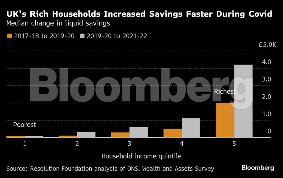 Τα νοικοκυριά του ανώτερου 20% είδαν τις αποταμιεύσεις τους να αυξάνονται κατά 4.200 λίρες στη διάρκεια της πανδημίας, ενώ τα φτωχότερα αποταμίευσαν μόλις 80 λίρες. Αντίθετα, μία στις δέκα οικογένειες με το χαμηλότερο εισόδημα έχασε έως και 4.000 λίρες από τις αποταμιεύσεις της — διπλάσιο ποσοστό σε σχέση με πριν την Covid.