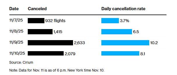 Περίπου 1.159 από τις 22.811 προγραμματισμένες πτήσεις της Τρίτης — ή περίπου το 5,1% — είχαν ακυρωθεί μέχρι τις 5:40 π.μ. ώρα Νέας Υόρκης, σύμφωνα με στοιχεία της FlightAware και της εταιρείας ανάλυσης αεροπορικών δεδομένων Cirium.