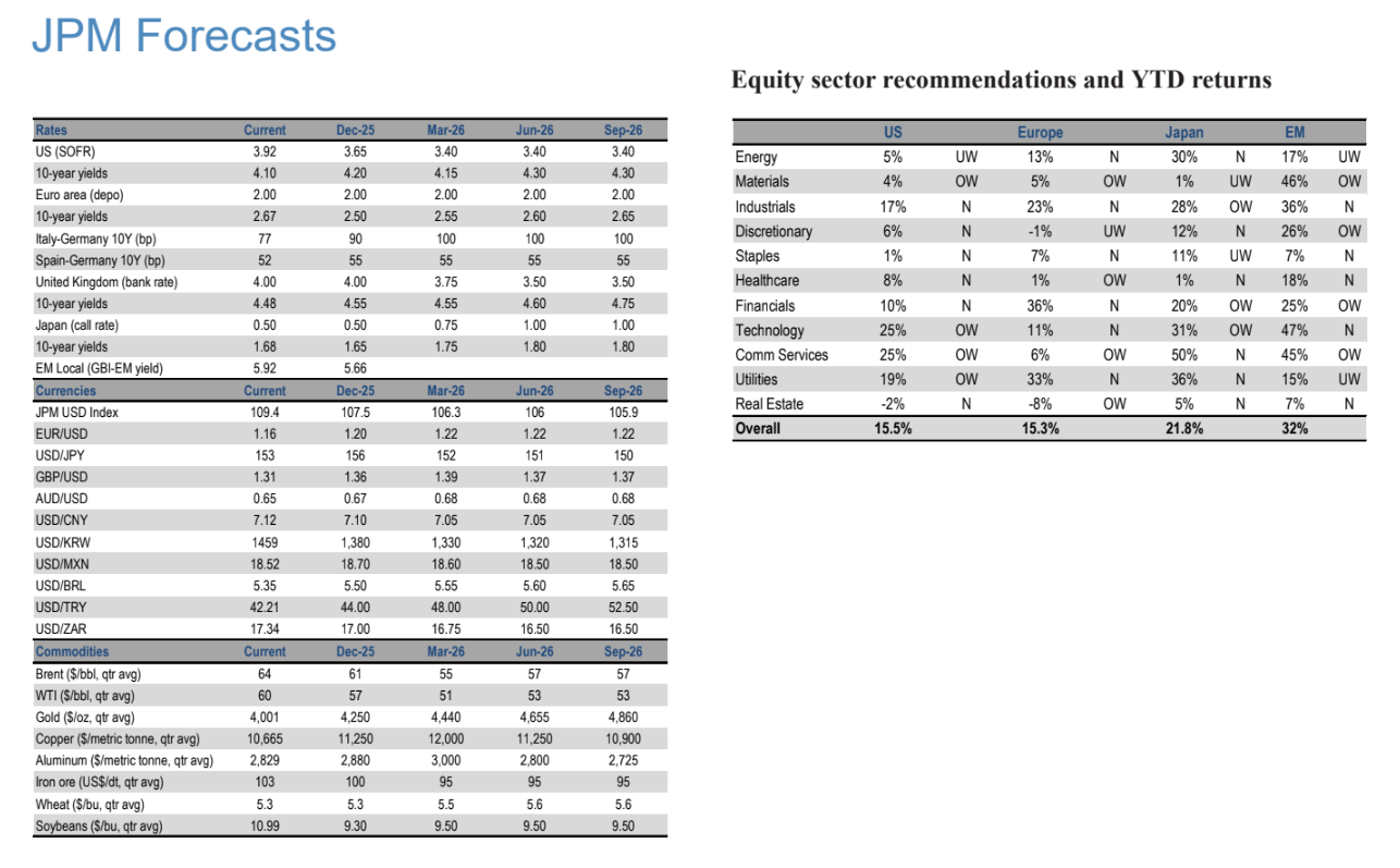 Στις βασικές προβλέψεις, η JP Morgan τοποθετεί τον δείκτη S&P 500 στις 6.000 μονάδες για τον Δεκέμβριο 2025, επιμένοντας ότι η διαδρομή θα είναι «ανώμαλη». Στα εμπορεύματα, διατηρείται ανοδική μεσοπρόθεσμη άποψη για τον χρυσό με μέσο στόχο για το δ’ τρίμηνο 2026 στα 5.055 δολάρια ανά ουγγιά, ενώ ο χαλκός επίσης παραμένει σε θετική τροχιά. Στις ισοτιμίες, ο δείκτης δολαρίου εκτιμάται χαμηλότερα το 2025-26, αλλά η «κοιλιά» της καμπύλης των αμερικανικών αποδόσεων πιέζεται, κάτι που μπορεί πρόσκαιρα να κρατήσει το δολάριο σφιχτό.