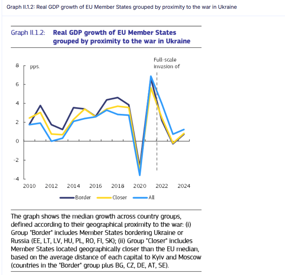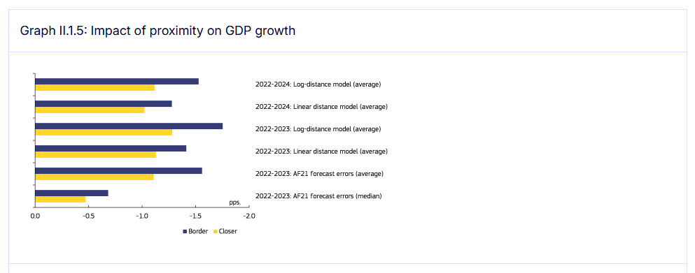 Αξιολογείται επίσης η σχετική οικονομική απόδοση των οκτώ χωρών που συνορεύουν είτε με την Ουκρανία είτε με τη Ρωσία, δηλαδή της Εσθονίας, της Φινλανδίας, της Ουγγαρίας, της Λετονίας, της Λιθουανίας, της Πολωνίας, της Ρουμανίας και της Σλοβακίας. Η ανάλυση επιβεβαιώνει ότι οι αρνητικές επιπτώσεις του πολέμου είναι πιο έντονες για εκείνες που βρίσκονται πιο κοντά στον πόλεμο. Τα κράτη μέλη που βρίσκονται πιο κοντά ή συνορεύουν με τη ζώνη του πολέμου παρουσίασαν ανάπτυξη άνω του μέσου όρου πριν από τον πόλεμο, γεγονός που έκανε τη μεταπολεμική συρρίκνωση να φαίνεται ακόμη πιο έντονη.