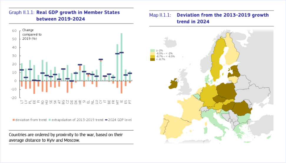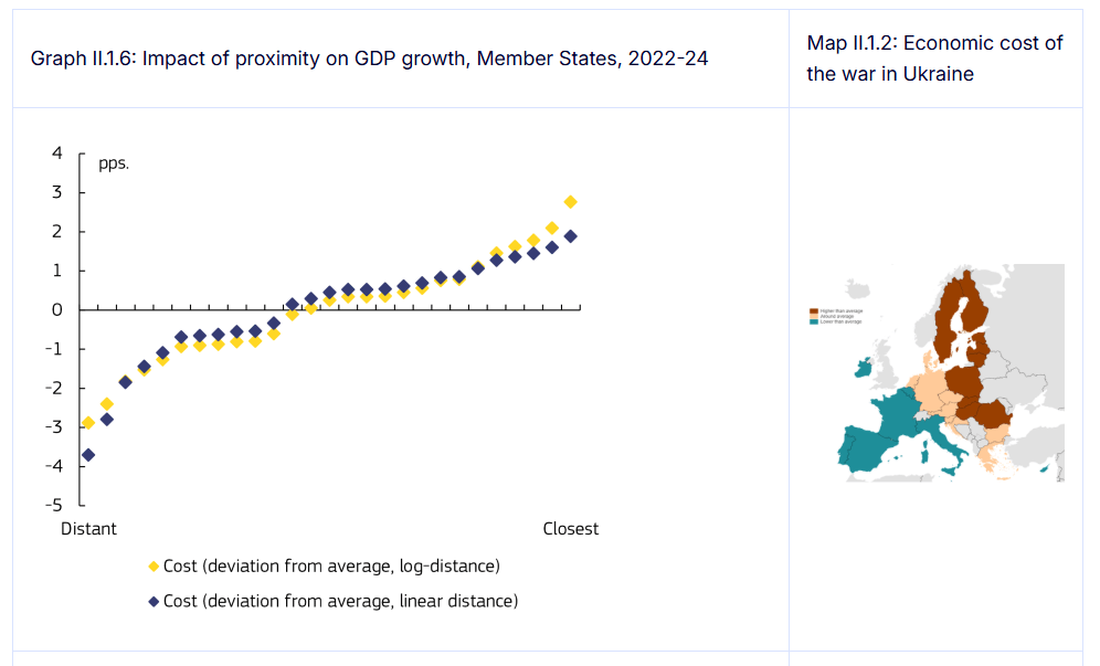 Η ανάλυση επικεντρώνεται στην μέση απόδοση των χωρών εντός της ομάδας των 13 κρατών μελών της ΕΕ που βρίσκονται γεωγραφικά πιο κοντά στον πόλεμο. Ο πραγματικός μέσος ετήσιος ρυθμός αύξησης του ΑΕΠ κατά τα δύο πρώτα έτη του πολέμου (2022-2023) ήταν 1,9 ποσοστιαίες μονάδες χαμηλότερος από την προπολεμική πρόβλεψη για το μέσο κράτος μέλος της ΕΕ.