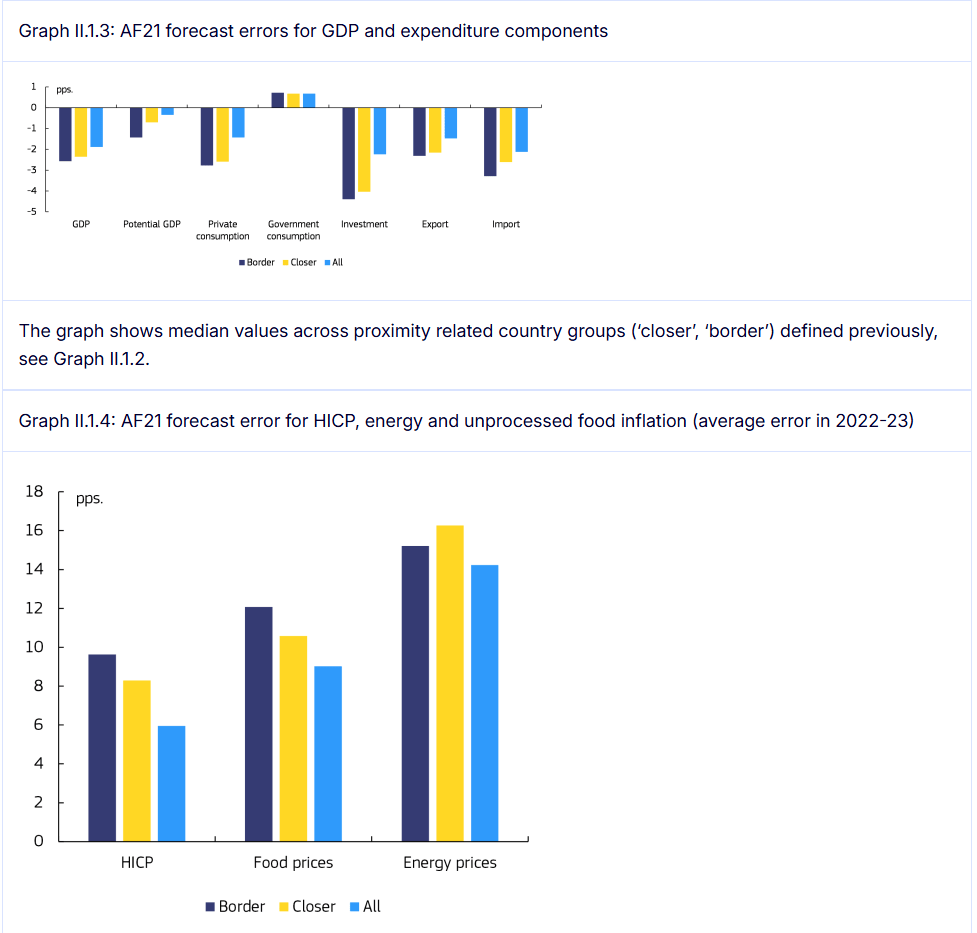 Η εγγύτητα στον πόλεμο συνδέεται επίσης με υψηλότερες πληθωριστικές διαταραχές. Τα σφάλματα στις προβλέψεις για τον πληθωρισμό είναι θετικά για το σύνολο της ΕΕ, επιβεβαιώνοντας τις μεγάλες πληθωριστικές επιπτώσεις του πολέμου. Ο πληθωρισμός βάσει του εναρμονισμένου δείκτη αποδείχθηκε κατά 5,9 εκατοστιαίες μονάδες ετησίως υψηλότερος από τις προπολεμικές προβλέψεις.