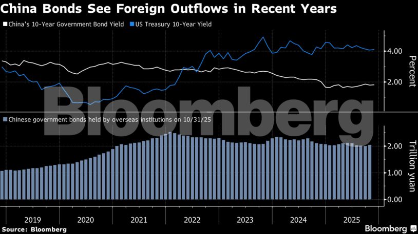 Σύμφωνα με στοιχεία της κεντρικής τράπεζας, οι ξένες συμμετοχές στο χρέος της χώρας μειώθηκαν στα 3,73 τρισεκατομμύρια γιουάν τον Οκτώβριο, το χαμηλότερο επίπεδο από τον Δεκέμβριο του 2023. Ένας από τους λόγους είναι το γεγονός ότι οι αποδόσεις των κινεζικών ομολόγων παραμένουν πολύ χαμηλότερες από αυτές των αμερικανικών.