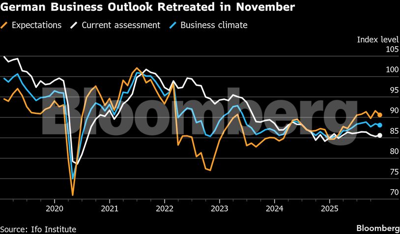 Ο δείκτης προσδοκιών του ινστιτούτου Ifo υποχώρησε στις 90,6 μονάδες από 91,6 τον Οκτώβριο, ενώ οι αναλυτές προέβλεπαν σταθερή εικόνα. Μικρή βελτίωση καταγράφηκε μόνο στην αξιολόγηση της τρέχουσας κατάστασης.