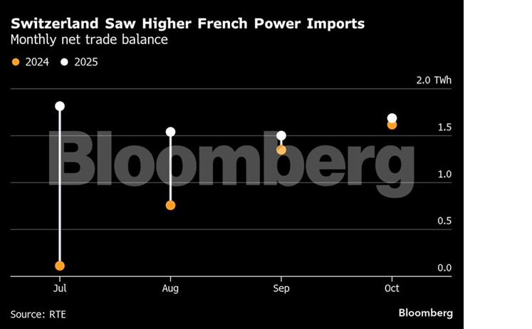 Οι καθαρές εξαγωγές προς την Ελβετία αυξήθηκαν πάνω από 70% σε σχέση με πέρυσι, ενώ προς το Ηνωμένο Βασίλειο ενισχύθηκαν κατά 30%. Η Ελβετία αντιμετωπίζει προβλήματα στη δική της πυρηνική παραγωγή. O σταθμός Μπεζνάου περιόρισε τη λειτουργία του εξαιτίας του φετινού καύσωνα, καθώς οι υψηλές θερμοκρασίες των ποταμών οδήγησαν σε μειωμένη ισχύ και μερικές διακοπές λειτουργίας. Το εργοστάσιο Γκέσγκεν βρίσκεται εκτός λειτουργίας από τον Μάιο λόγω τεχνικών προβλημάτων που εντόπισαν οι ρυθμιστικές αρχές.