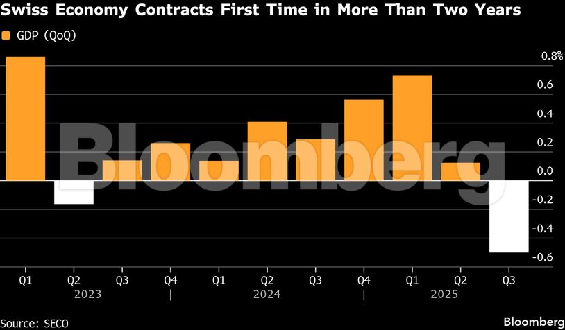 Η πρώτη περίοδος ύφεσης της Ελβετίας έπειτα από περισσότερα από δύο χρόνια οφείλεται κυρίως στο διεθνές εμπόριο, καθώς οι εξαγωγείς φαρμακευτικών και χημικών προϊόντων δέχθηκαν ισχυρό πλήγμα από τους αυξημένους δασμούς των Ηνωμένων Πολιτειών. Το ΑΕΠ, προσαρμοσμένο για μεγάλες αθλητικές διοργανώσεις, υποχώρησε κατά 0,5% στο τρίμηνο έως τον Σεπτέμβριο σε σχέση με την προηγούμενη περίοδο, σύμφωνα με τη Γραμματεία Οικονομικών Υποθέσεων, επιβεβαιώνοντας την αρχική εκτίμηση που είχε ανακοινωθεί την περασμένη εβδομάδα. Η πτώση έρχεται σε αντίθεση με την ανάπτυξη 0,2% που καταγράφηκε το δεύτερο τρίμηνο – ποσοστό αναθεωρημένο προς τα πάνω από το προηγούμενο 0,1%.