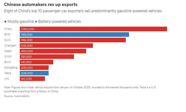 Ο κορυφαίος εξαγωγέας αυτοκινήτων της Κίνας είναι η Chery, της οποίας οι παγκόσμιες πωλήσεις εκτοξεύτηκαν από 730.000 οχήματα σε 2,6 εκατομμύρια μεταξύ 2020 και 2024. Η Chery, η οποία έχει κρατικούς και ιδιώτες ιδιοκτήτες, αύξησε τις ετήσιες εξαγωγές της κατά την περίοδο αυτή κατά περίπου ένα εκατομμύριο μονάδες – βασιζόμενη κυρίως στα βενζινοκίνητα οχήματα που αποτελούν τα τέσσερα πέμπτα των πωλήσεών της. Οι 10 κορυφαίοι εξαγωγείς της Κίνας περιλαμβάνουν πέντε άλλες κρατικές αυτοκινητοβιομηχανίες και δύο ιδιωτικές, την Geely και την Great Wall Motor, που πωλούν επίσης περισσότερα βενζινοκίνητα οχήματα από ό,τι ηλεκτρικά οχήματα.