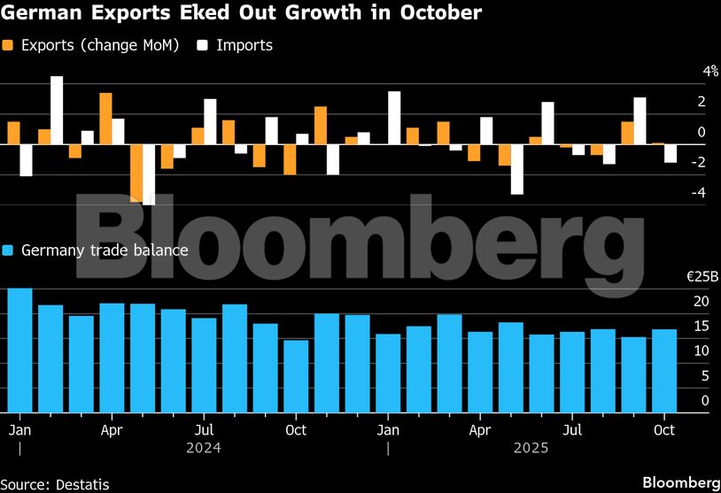 Οι εξαγωγές στο εξωτερικό αυξήθηκαν κατά 0,1% σε σχέση με τον προηγούμενο μήνα, και κατά 4,2% σε σχέση με τον Οκτώβριο του 2024 σύμφωνα με τα στοιχεία που δημοσίευσε η στατιστική υπηρεσία Destatis. Οι εισαγωγές μειώθηκαν περισσότερο από το αναμενόμενο, κατά 1,2% σε μηνιαία βάση, στα 114,5 δισ. ευρώ, ενώ σε σύγκριση με τον ίδιο μήνα του προηγούμενου έτους, οι εισαγωγές αυξήθηκαν κατά 2,8%, αυξάνοντας το εμπορικό πλεόνασμα σε 16,9 δισ. ευρώ.