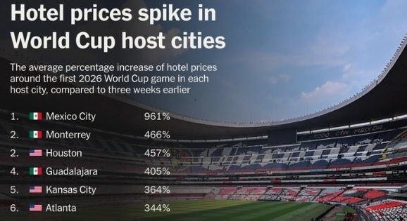 Σύμφωνα με ανάλυση που δημοσιεύθηκε από το αμερικανικό μέσο ενημέρωσης «The Athletic», διαπιστώθηκε μια μέση αύξηση 300% στις τιμές των δωματίων ξενοδοχείων στις 16 πόλεις που θα διεξαχθούν αγώνες του Μουντιάλ 2026.