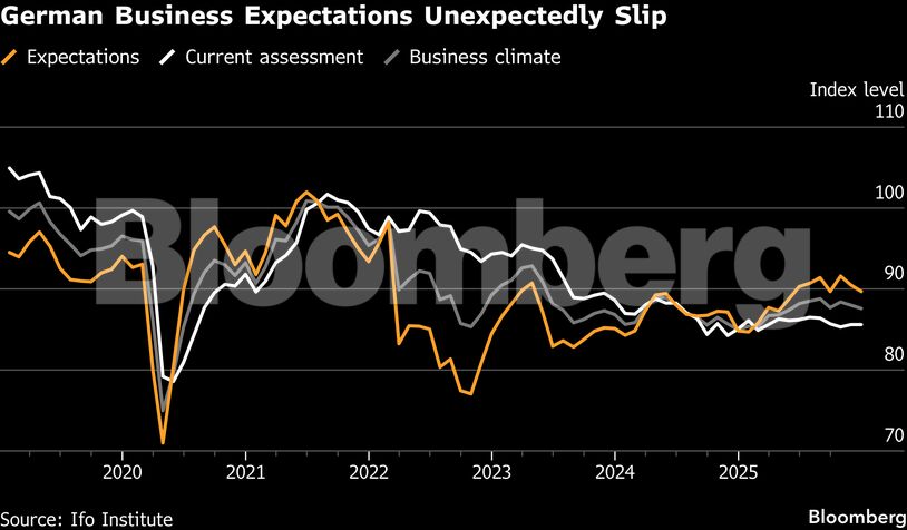 Ο δείκτης προσδοκιών του ινστιτούτου Ifo υποχώρησε τον Ιανουάριο στις 89,5 μονάδες από 89,7 τον Δεκέμβριο, σύμφωνα με έκθεση που δημοσιεύθηκε τη Δευτέρα. Οι οικονομολόγοι που συμμετείχαν σε έρευνα του Bloomberg ανέμεναν άνοδο στις 90,3 μονάδες. Αντίθετα, ο δείκτης που αποτυπώνει τις τρέχουσες συνθήκες σημείωσε οριακή βελτίωση.