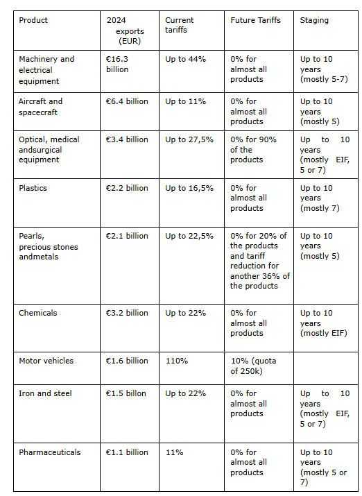 Βάσει της εν λόγω εμπορικής συμφωνίας η Ινδία θα χορηγήσει στην ΕΕ δασμολογικές μειώσεις που δεν έχει λάβει κανένας από τους άλλους εμπορικούς της εταίρους. Οι ευρωπαϊκές εταιρείες πραγματοποιούν εξαγωγές μηχανημάτων και ηλεκτρικού εξοπλισμού ύψους 16,3 δισ. ευρώ, με τους ισχύοντες δασμούς να ανέρχονται στο 44%. Βάσει της συμφωνίας οι δασμοί θα μειωθούν στο 0% σε ένα χρονικό διάστημα 5 – 7 έτη. Οι δασμοί στα αεροσκάφη οι οποίοι ανέρχονται στο 11% θα μηδενιστούν στο αντίστοιχο χρονικό διάστημα, ενώ για τα προϊόντα ιατρικού και χειρουργικού εξοπλισμού οι δασμοί, οι οποίο ανέρχονται στο 27,5% αναμένεται να μηδενιστούν επίσης για το σύνολο σχεδόν αυτών των προϊόντων.