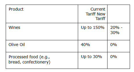 Οι δασμοί που επιβάλλει η Ινδία στον οίνο που παράγεται στην ΕΕ ανέρχονται στο 150%, ενώ βάσει της συμφωνίας θα μειωθούν σταδιακά στο 20% – 30%. Στην μπύρα οι δασμοί θα μειωθούν από το 150% στο 50%, στο ελαιόλαδο, τη μαργαρίνη και άλλα φυτικά έλαια οι δασμοί, που σήμερα ανέρχονται στο 45%, θα μηδενιστούν, ενώ στα ακτινίδια και τα αχλάδια οι δασμοί θα μειωθούν από το 33% στο 10%. Μηδενισμός των δασμών προβλέπεται και για τους χυμούς φρούτων και τις μη αλκοολούχες μπύρες, όπως επίσης και για τα επεξεργασμένα τρόφιμα (ψωμιά, αρτοσκευάσματα, μπισκότα, ζυμαρικά, σοκολάτα, τροφές για κατοικίδια).