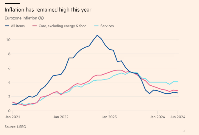 Οι ρυθμιστές των επιτοκίων συμφώνησαν σε γενικές γραμμές ότι ο πληθωρισμός οδεύει προς τη σωστή κατεύθυνση, με τα τελευταία στοιχεία που δημοσιεύθηκαν την Τρίτη να δείχνουν ότι ο πληθωρισμός στην Ευρωζώνη είχε επανέλθει στην καθοδική του τροχιά στο 2,5% τον Ιούνιο, μετά από μια σύντομη άνοδο στο 2,6% τον Μάιο.