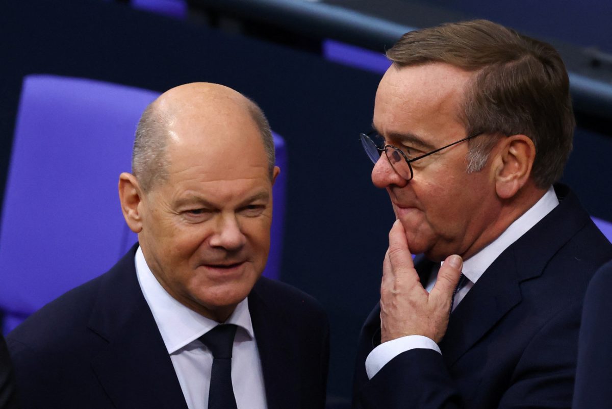 Ο καγκελάριος, Όλαφ Σολτς λοξοκοιτά τον υπουργό Άμυνας, Μπόρις Πιστόριους, ενώ παρευρίσκονται στην τελετή παραλαβής από τη Γερμανία του πρώτου επιχειρησιακού συστήματος αεράμυνας IRIS-T SLM, τον περασμένο Σεπτέμβριο (REUTERS/Fabian Bimmer/File Photo)