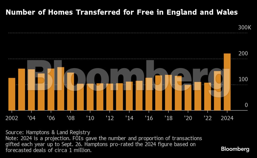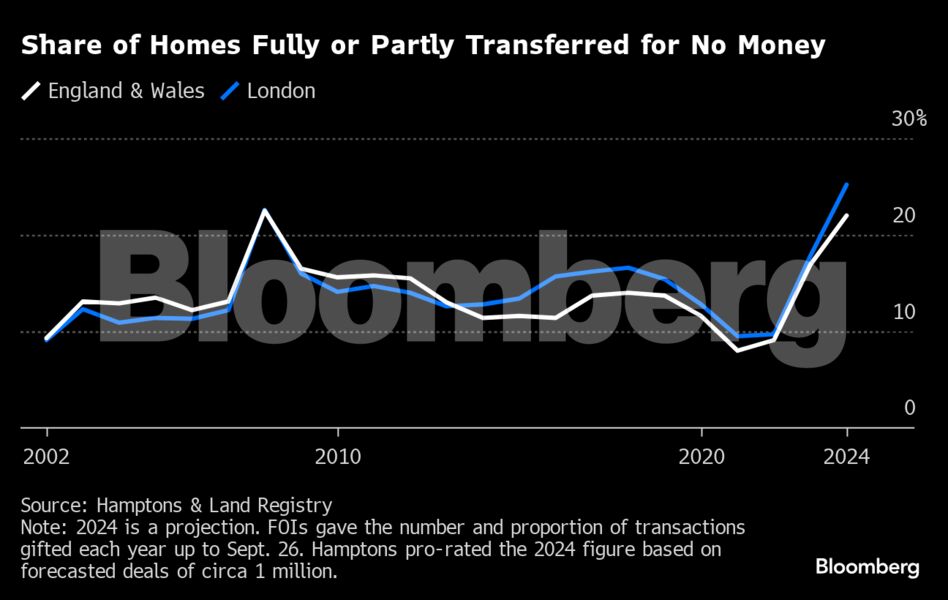 Σύμφωνα με στοιχεία που συγκέντρωσε η μεσιτική εταιρεία Hamptons από το Κτηματολόγιο και τα οποία δημοσιεύει το Bloomberg, περισσότερα από 220.000 ακίνητα αναμένεται να αλλάξουν χέρια (σχεδόν) δωρεάν – το 2024, αριθμός αυξημένος κατά 45% σε σχέση με το προηγούμενο έτος. Στο Λονδίνο, πάνω από το 25% των ακινήτων θα μεταβιβαστούν χωρίς χρηματικό αντάλλαγμα.