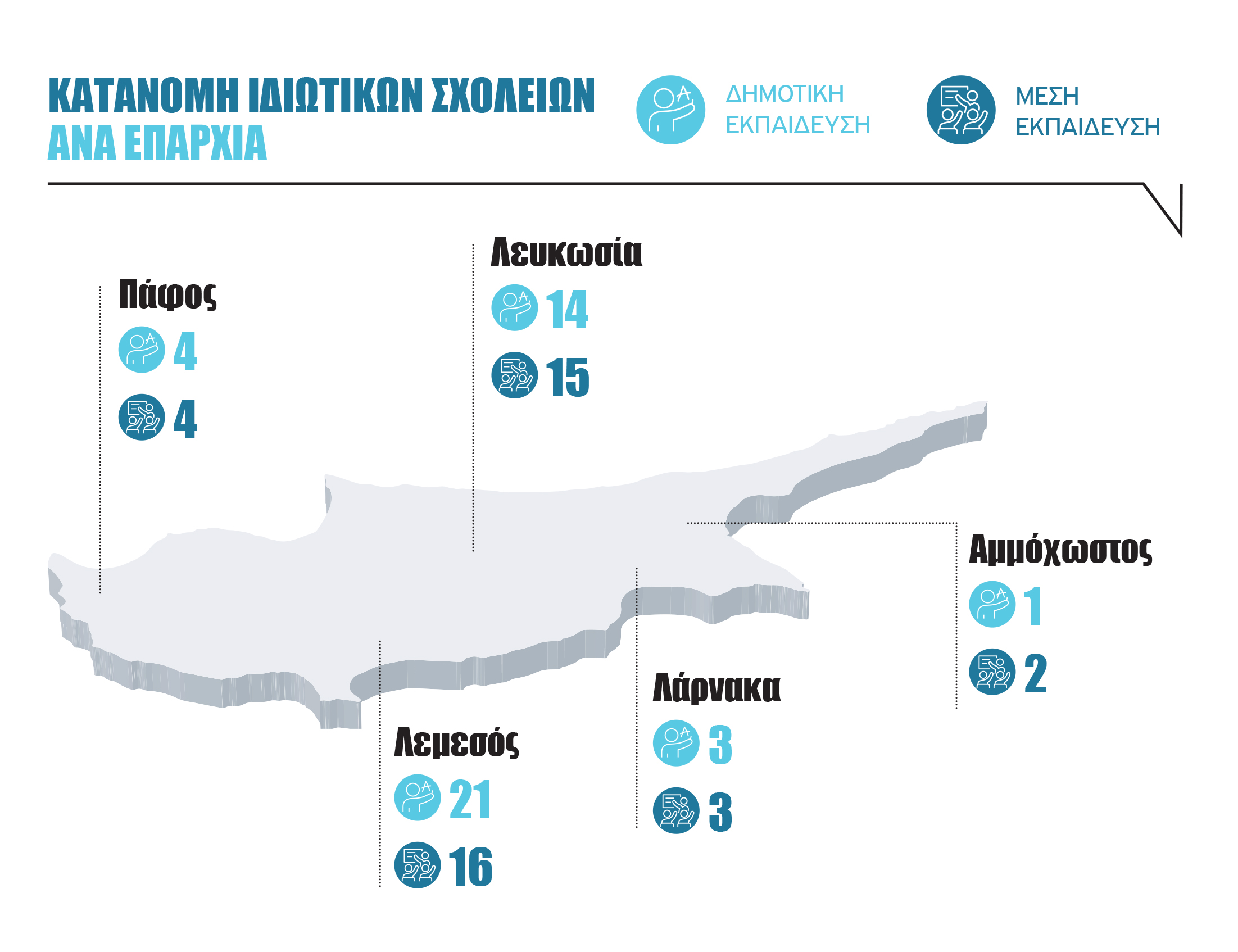 Στην Κύπρο λειτουργούν συνολικά 83 ιδιωτικά σχολεία δημοτικής εκπαίδευσης και ιδιωτικά σχολεία Μέσης Εκπαίδευσης. Στη δημοτική εκπαίδευση, η πρωτεύουσα φιλοξενεί 14 ιδιωτικά δημοτικά, ενώ η Λεμεσός ξεπερνά τα 20. Στο άλλο άκρο, η Λάρνακα διαθέτει μόλις τρία, η Πάφος τέσσερα και η Αμμόχωστος μόνο ένα ιδιωτικό δημοτικό σχολείο. Η εικόνα στη Μέση Εκπαίδευση δεν διαφέρει και πολύ. 15 σχολεία στη Λευκωσία, 16 στη Λεμεσό, 3 στη Λάρνακα, 4 στην Πάφο και 2 στην Αμμόχωστο.