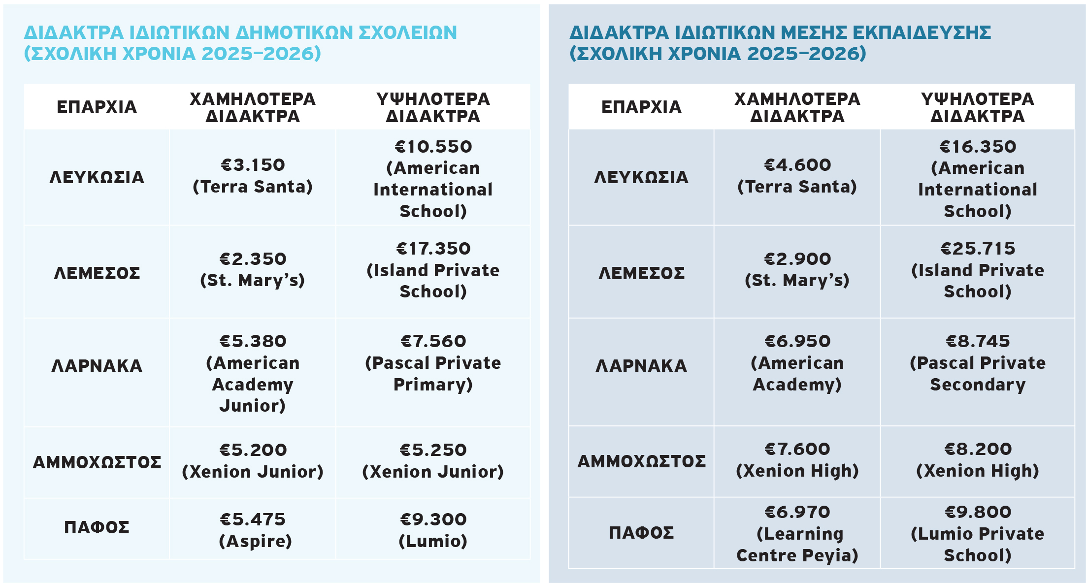 Τα δίδακτρα στα ιδιωτικά δημοτικά σχολεία για τη σχολική χρονιά 2025 - 2026 παρουσιάζουν μεγάλες διαφοροποιήσεις, ανάλογα με την επαρχία και το πρόγραμμα σπουδών. Στη Λευκωσία, για παράδειγμα, κυμαίνονται από €3.150 στο Terra Santa μέχρι και €10.550 στο American International School of Cyprus, ενώ στη Λεμεσό φτάνουν ακόμα και τα €17.350 στο Island Private School. Στην Πάφο τα δίδακτρα κυμαίνονται από €5.475 έως €9.300, ενώ στη Λάρνακα από €5.380 έως €7.560. Πέρα από τα βασικά δίδακτρα, σχεδόν όλα τα σχολεία χρεώνουν επιπρόσθετα ποσά για εγγραφή (€100 - €700), επανεγγραφή, βιβλία (€150 - €650 ανά έτος), στολές (€200 - €380), τέλη τεχνολογίας, εκδρομές, καθώς και άλλες χρεώσεις για ανάπτυξη ή capital levy που σε ορισμένα σχολεία ξεπερνούν τα €1.000