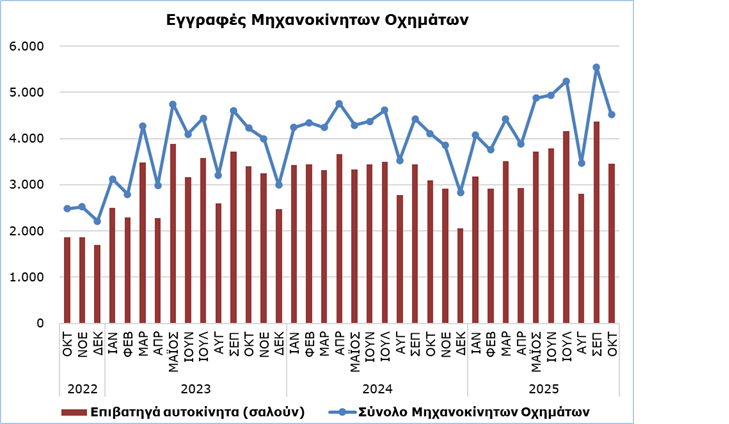 Σύμφωνα με την Στατιστική Υπηρεσία, ο συνολικός αριθμός των εγγραφέντων οχημάτων αυξήθηκε κατά 4,2% την περίοδο Ιανουαρίου-Οκτωβρίου 2025 και έφτασε τις 44.732, σε σύγκριση με 42.930 κατά την ίδια περίοδο του 2024.