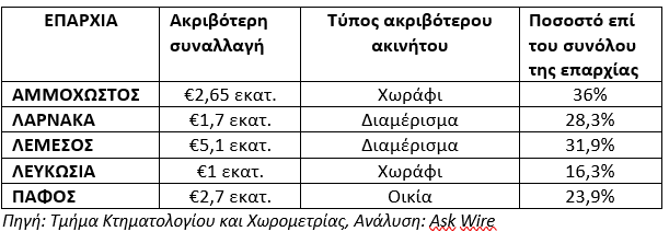 Ο Παύλος Λοΐζου, Διευθύνων Σύμβουλος της Ask Wire, σχολιάζοντας τα πιο πάνω δεδομένα δήλωσε τα εξής: «Τον Σεπτέμβριο η αγορά ακινήτων υψηλής αξίας θα μπορούσε να χαρακτηριστεί κάπως υποτονική δεδομένου ότι μόνο 15 πωλήσεις έγιναν σε αξίες άνω του €1 εκατ. και αυτό είναι κάτι το οποίο αντικατοπτρίζεται και στη συνολική αξία των 50 ακριβότερων συναλλαγών Παγκύπρια, η οποία διαμορφώθηκε στα €46,8 εκατ. Η αγορά των οικιστικών ακινήτων ξεχώρισε καθώς 22 πωλήσεις αφορούσαν οικίες και άλλες έξι διαμερίσματα. Η αγορά γης ακολούθησε με 13 πωλήσεις χωραφιών και δύο οικοπέδων. Σημαντικές είναι όμως οι πωλήσεις γραφείων καθώς δύο από τις πέντε, που έγιναν συνολικά τον περασμένο Σεπτέμβριο, συγκαταλέγονται στις 10 ακριβότερες του μήνα. Η αξία και των πέντε πωλήσεων μαζί φτάνει τα €6,1 εκατ. και είναι ίση με την συνολική αξία των 10 ακριβότερων πωλήσεων της επαρχίας Λευκωσίας και ξεπερνά το άθροισμα των 10 ακριβότερων πωλήσεων της επαρχίας Λάρνακας. Το γεγονός ότι οι τέσσερις από τις πέντε συναλλαγές έγιναν στη Λεμεσό δεν μπορεί να περάσει απαρατήρητο γιατί συνάδει με το νέο μοντέλο ανάπτυξης της πόλης τα τελευταία χρόνια». Για περισσότερες πληροφορίες και δεδομένα για την αγορά ακινήτων επισκεφθείτε τη σελίδα της Ask Wire.