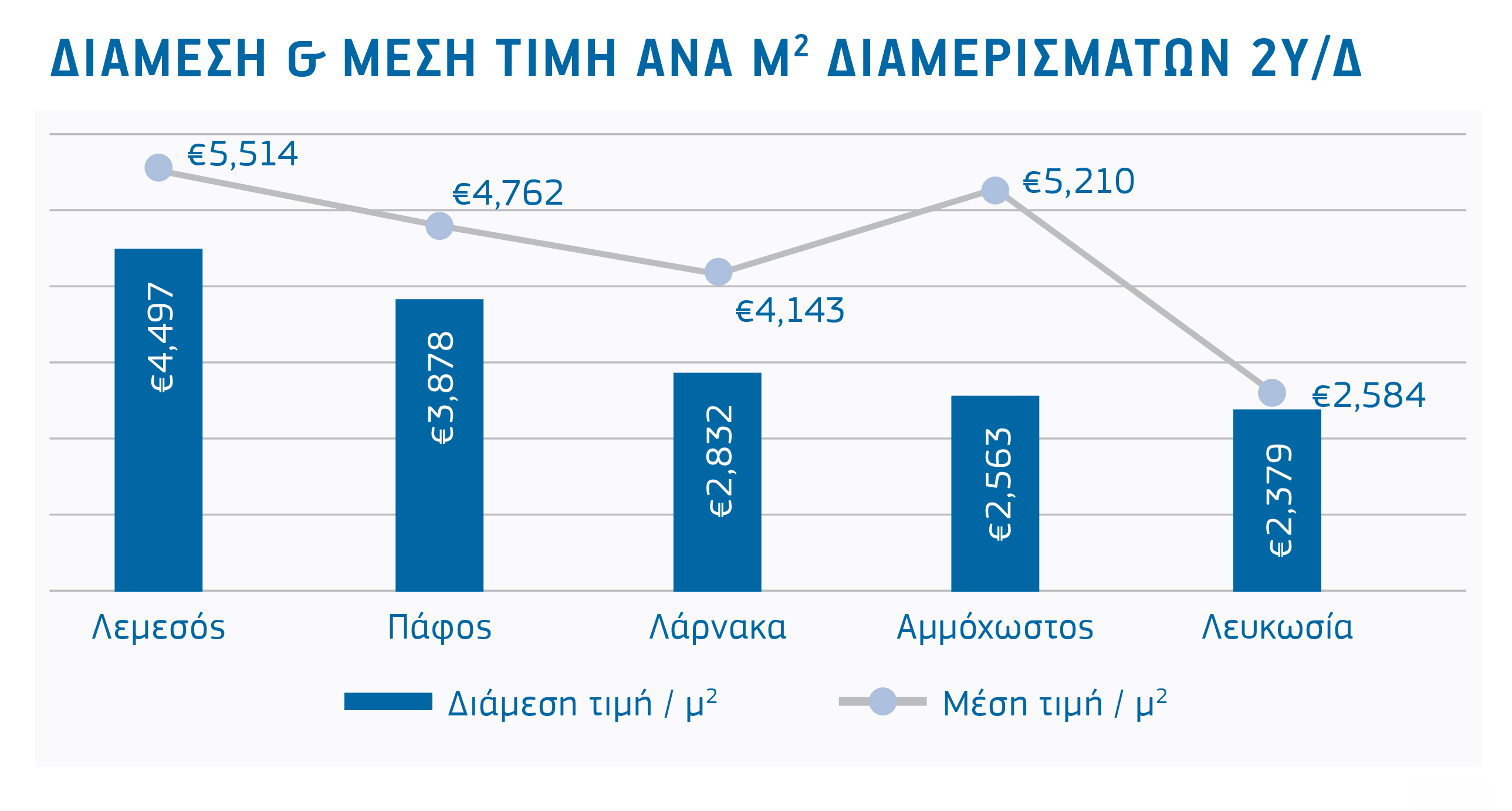 Η AXIA Chartered Surveyors σε συνεργασία με το portal BuySell Cyprus (το μεγαλύτερο portal στην Κύπρο βάσει αριθμών), ανέλυσε περίπου 120.000 καταχωρήσεις αγγελιών ακινήτων, εστιάζοντας στα διαμερίσματα δύο υπνοδωματίων. Φυσικά, πρόκειται για αγγελίες ακινήτων και όχι για πωλήσεις, αλλά θεωρώ πως είναι σημαντική ένδειξη της αγοράς και πιο συγκεκριμένα της υποαγοράς των διαμερισμάτων δύο υπνοδωματίων. Στο παρακάτω διάγραμμα, όπως προέκυψε από την έρευνα, παρουσιάζονται συνολικά οι αξίες ανά τ.μ. των διαμερισμάτων δύο υπνοδωματίων σε παγκύπρια βάση και ανά επαρχία. Για ορθότερη ανάλυση υπολογίστηκε και ο μέσος όρος αλλά και η διάμεση τιμή.