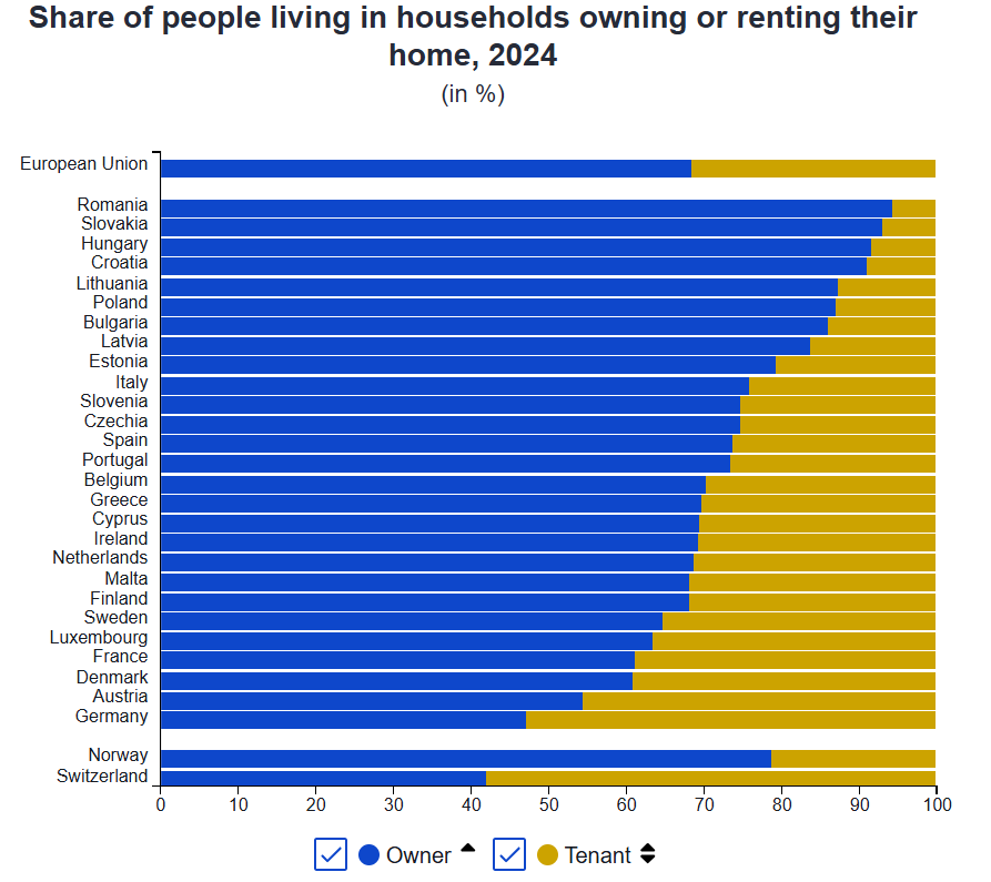 Τα υψηλότερα ποσοστά ιδιοκατοίκησης παρατηρούνται στην Ρουμανία (94%), στη Σλοβακία (93%), στην Ουγγαρία (92%) και στην Κροατία (91%).