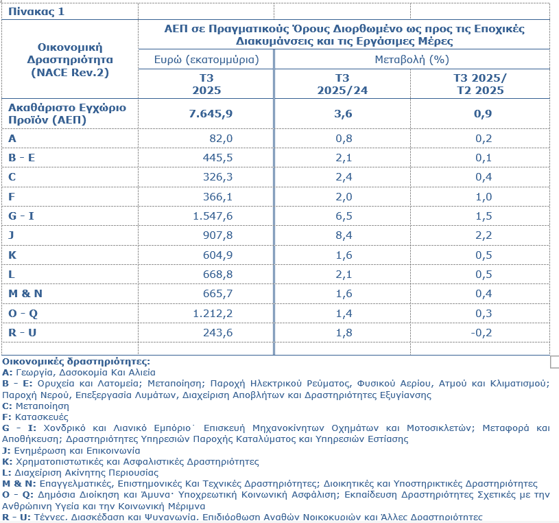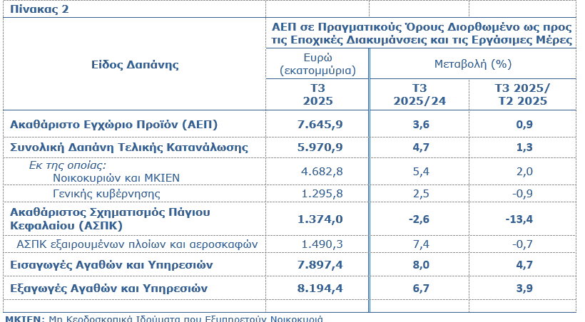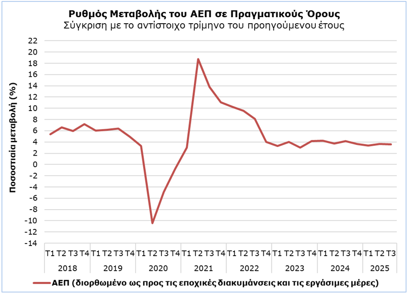 Συγκεκριμένα ο ρυθμός ανάπτυξης του ΑΕΠ σε πραγματικούς όρους (εποχικά προσαρμοσμένος), κατά το τρίτο τρίμηνο του 2025 είναι θετικός και υπολογίζεται σε 3,6% σε σύγκριση με το αντίστοιχο τρίμηνο του 2024. Σε σχέση με το δεύτερο τρίμηνο το ΑΕΠ αυξήθηκε κατά 0,9% και σύμφωνα με την Στατιστική Υπηρεσία ανήλθε σε €7.645,9 εκ.