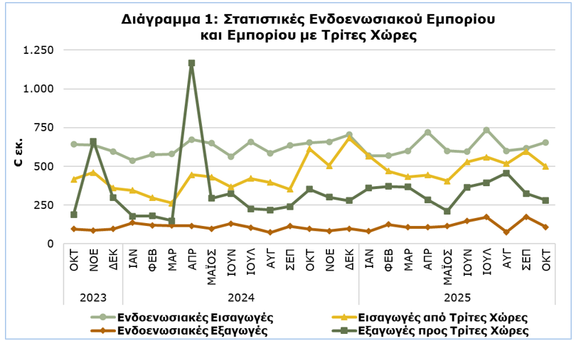 Οι συνολικές εισαγωγές αγαθών για την περίοδο Ιανουαρίου–Οκτωβρίου 2025 ήταν €11.270,8 εκ. σε σύγκριση με €10.034,5 εκ. για την περίοδο Ιανουαρίου–Οκτωβρίου 2024, σημειώνοντας αύξηση 12,3%. Οι συνολικές εξαγωγές αγαθών για την περίοδο Ιανουαρίου–Οκτωβρίου 2025 ήταν €4.616,1 εκ. σε σύγκριση με €4.427,8 εκ. για την περίοδο Ιανουαρίου–Οκτωβρίου 2024, σημειώνοντας αύξηση 4,3%. Ως αποτέλεσμα το έλλειμμα του εμπορικού ισοζυγίου ήταν €6.654,7 εκ. για την περίοδο Ιανουαρίου–Οκτωβρίου 2025 σε σύγκριση με €5.606,7 εκ. την αντίστοιχη περίοδο του 2024.