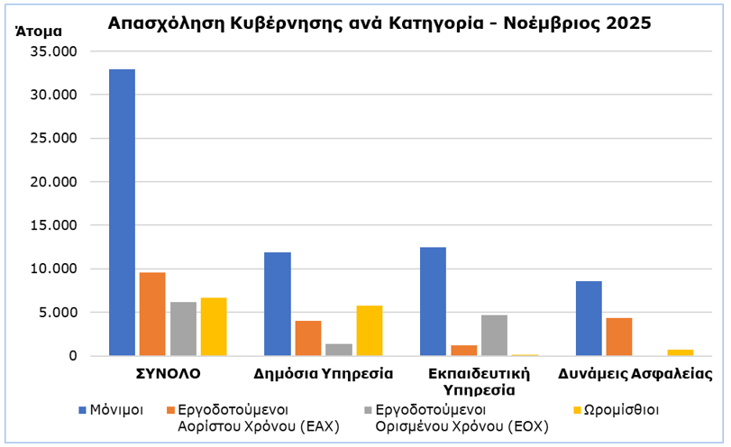 Σημειώνεται ότι η μεγάλη μείωση που παρατηρείται στους ΕΟΧ των Δυνάμεων Ασφαλείας (-74,0%) οφείλεται κατά κύριο λόγο στην ολοκλήρωση και μη επέκταση συγκεκριμένων συμβάσεων ορισμένου χρόνου κατά τον Ιούλιο 2025. Για την περίοδο Ιανουαρίου – Νοεμβρίου 2025 ο μέσος όρος της συνολικής απασχόλησης στην Κυβέρνηση αυξήθηκε κατά 0,6% σε σύγκριση με την αντίστοιχη περίοδο του 2024.