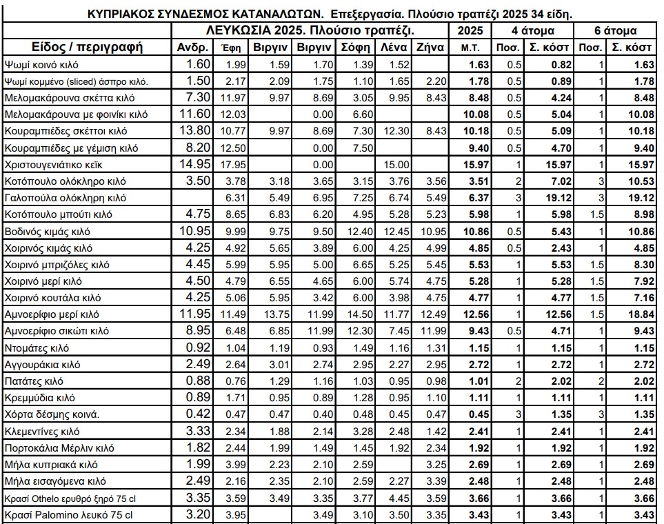 Η έρευνα του Συνδέσμου πραγματοποιήθηκε από τις 10 έως τις 19 Δεκεμβρίου 2025 και περιλάμβανε τρεις τιμοληψίες λιανικών τιμών. Οι καταγραφές έγιναν αποκλειστικά σε υπεραγορές στη Λευκωσία και αφορούσαν συνολικά 34 είδη τροφίμων και ποτών.