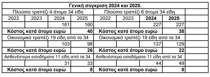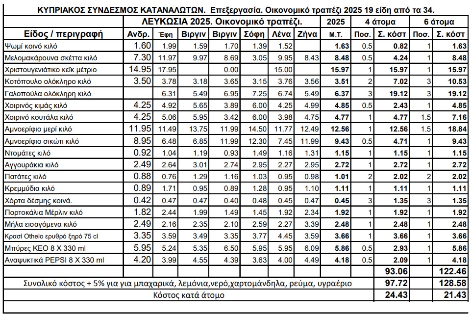 Για την εκδοχή του «οικονομικού» τραπεζιού, που περιλαμβάνει 19 είδη, το συνολικό κόστος υπολογίζεται στα 98 ευρώ για οικογένεια τεσσάρων ατόμων και στα 129 ευρώ για οικογένεια έξι ατόμων.