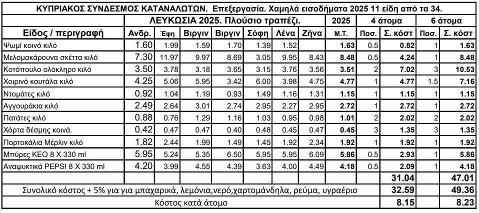 Σύμφωνα με τα αποτελέσματα, το συνολικό κόστος του «πλούσιου» χριστουγεννιάτικου τραπεζιού στη Λευκωσία ανέρχεται στα 160 ευρώ για τετραμελή οικογένεια και στα 227 ευρώ για εξαμελή. Σε σύγκριση με το 2024, δεν καταγράφεται οποιαδήποτε διαφοροποίηση, με το κόστος να παραμένει ουσιαστικά αμετάβλητο.