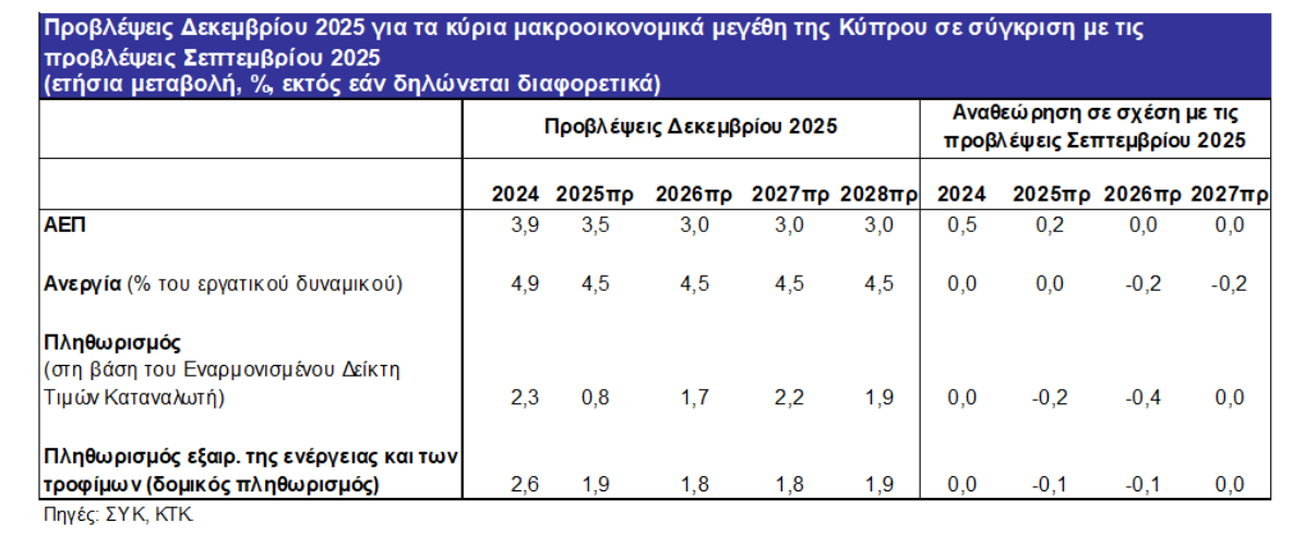 Οι νέες προβλέψεις της ΚΤΚ, οι προβλέψεις Δεκεμβρίου για τα κύρια μακροοικονομικά μεγέθη της Κύπρου για τα έτη 2025-28 , δόθηκαν σήμερα στη δημοσιότητα και ατυές αφορούν τις εκτιμήσεις της για το Ακαθάριστο Εγχώριο Προϊόν (ΑΕΠ), την ανεργία, τον πληθωρισμό και τον πληθωρισμό εξαιρουμένης της ενέργειας και των τροφίμων (δομικός πληθωρισμός).