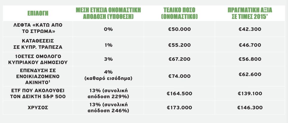 Για να γίνει κατανοητό τι σημαίνει «λεφτά κάτω από το στρώμα» ας υποθέσουμε ότι ένα νοικοκυριό είχε €50.000 το 2015 και τα τοποθετούσε σε διαφορετικές επιλογές μέχρι το 2025. Για το παράδειγμα, θα χρησιμοποιήσουμε ενδεικτικές, στρογγυλοποιημένες μέσες αποδόσεις 10ετίας, βασισμένες σε επίσημα ή διεθνώς αναγνωρισμένα στοιχεία όπως τα σημειώνουμε πιο κάτω: