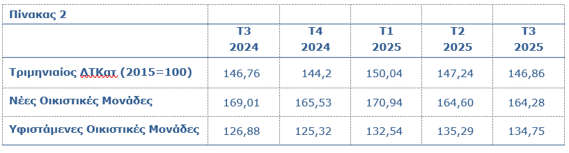 Ο δείκτης για τις Νέες Οικιστικές Μονάδες κατά το τρίτο τρίμηνο του 2025 υπολογίζεται στις 164,28 μονάδες, σε σύγκριση με 164,60 μονάδες το προηγούμενο τρίμηνο. Αντίστοιχα, ο δείκτης για τις Υφιστάμενες Οικιστικές Μονάδες διαμορφώθηκε στις 134,75 μονάδες, έναντι 135,29 μονάδων το δεύτερο τρίμηνο του 2025.