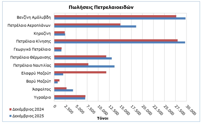Κατά τον Δεκέμβριο 2025, οι συνολικές πωλήσεις πετρελαιοειδών έφτασαν τους 123.274 τόνους, σημειώνοντας άνοδο 4,9% σε σχέση με τον Δεκέμβριο 2024.