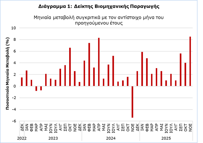 Ο Δείκτης Βιομηχανικής Παραγωγής για τον μήνα Νοέμβριο 2025 έφθασε στις 111,2 μονάδες (βάση 2021=100), σημειώνοντας αύξηση 8,5% σε σύγκριση με τον Νοέμβριο 2024, σύμφωνα με τα στοιχεία που δημοσίευσε σήμερα η Στατιστική Υπηρεσία.