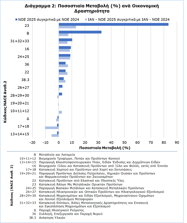 Στον μεταποιητικό τομέα, οι σημαντικότερες θετικές μεταβολές σε σύγκριση με τον Νοέμβριο του 2024 παρουσιάστηκαν στις εξής οικονομικές δραστηριότητες: κατασκευή άλλων μη μεταλλικών ορυκτών προϊόντων (+83,6%), κατασκευή επίπλων, άλλες μεταποιητικές δραστηριότητες και επισκευή και εγκατάσταση μηχανημάτων και εξοπλισμού (+10,3%), βιομηχανία ξύλου και κατασκευή προϊόντων από ξύλο και φελλό, εκτός από έπιπλα (+9,3%) και παραγωγή βασικών μετάλλων και κατασκευή μεταλλικών προϊόντων (+8,9%). Οι μόνες αρνητικές μεταβολές παρατηρήθηκαν στις δραστηριότητες παραγωγής κλωστοϋφαντουργικών υλών, ειδών ένδυσης και δερμάτινων ειδών (-1,2%) και κατασκευής χαρτιού και προϊόντων από χαρτί και εκτυπώσεις (-1,2%).