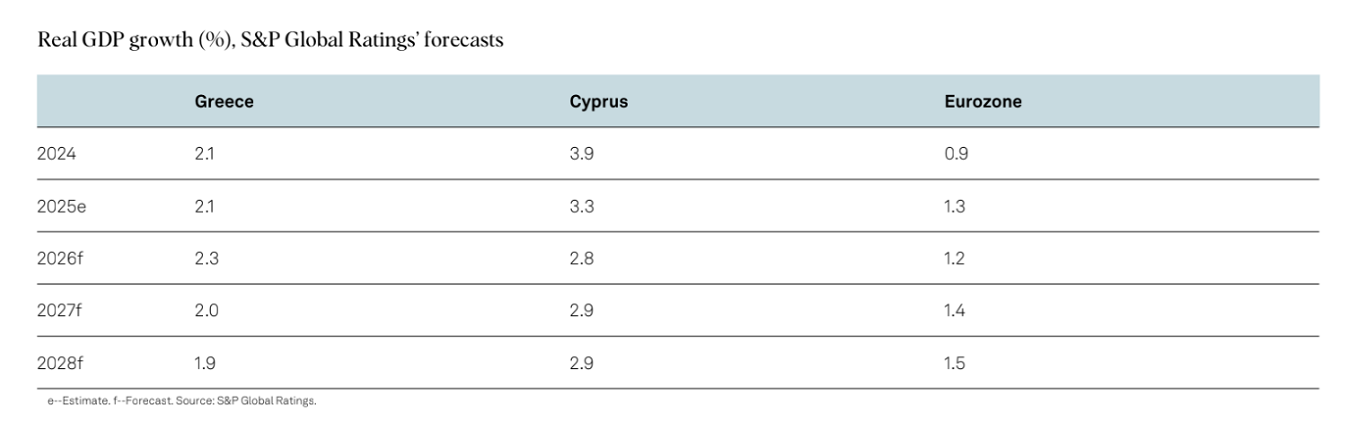 Στο καθαρά μακροοικονομικό σκέλος, η εικόνα είναι θετική. Η S&P προβλέπει ότι τόσο η Ελλάδα όσο και η Κύπρος θα συνεχίσουν να υπεραποδίδουν σε όρους ρυθμών μεγέθυνσης έναντι της ευρωζώνης τα επόμενα χρόνια. Για την Ελλάδα, η ανάπτυξη εκτιμάται στο 2,3% το 2026 και στο 2,0% το 2027, ενώ για την Κύπρο στο 2,8% και 2,9% αντίστοιχα, όταν η ευρωζώνη αναμένεται να κινηθεί κοντά στο 1,2%-1,4%. Η υπεραπόδοση αυτή, ιδίως για την Ελλάδα, αποδίδεται σε μεγάλο βαθμό στην αξιοποίηση των πόρων του Ταμείου Ανάκαμψης, οι οποίοι λειτουργούν ως αντιστάθμισμα στη σταδιακή απόσυρση των ευρωπαϊκών επιχορηγήσεων μετά το 2026.