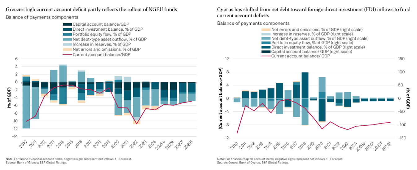 Το βασικό σημείο προβληματισμού για τον οίκο εντοπίζεται στο εξωτερικό ισοζύγιο. Ελλάδα και Κύπρος συγκαταλέγονται μεταξύ των χωρών με τα υψηλότερα ελλείμματα τρεχουσών συναλλαγών στην ευρωζώνη, τάση που αναμένεται να συνεχιστεί και την περίοδο 2026-2028. Στην Ελλάδα, το έλλειμμα συνδέεται εν μέρει με την αυξημένη εισαγωγική δραστηριότητα που συνοδεύει την υλοποίηση των επενδύσεων του Ταμείου Ανάκαμψης, ενώ στην Κύπρο η χρηματοδότηση του ελλείμματος έχει μετατοπιστεί από το χρέος προς τις άμεσες ξένες επενδύσεις. Παρά τη διαφοροποίηση αυτή, η S&P επισημαίνει ότι και στις δύο περιπτώσεις η εξάρτηση από εξωτερική χρηματοδότηση παραμένει δομική αδυναμία.
