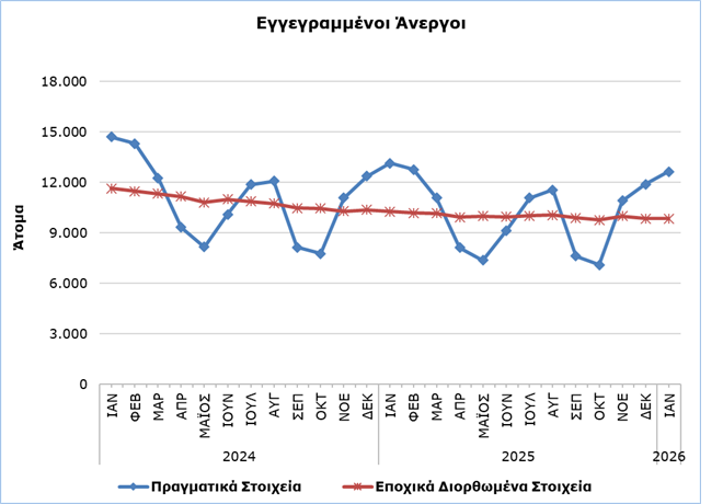 Σε σύγκριση με τον Ιανουάριο 2025 καταγράφηκε μείωση κατά 497 άτομα ή 3,8%. Η μείωση αυτή αποδίδεται κυρίως στους τομείς των κατασκευών, των υπηρεσιών παροχής καταλύματος και υπηρεσιών εστίασης, του εμπορίου, της μεταποίησης, καθώς και στη μείωση των νεοεισερχομένων στην αγορά εργασίας.
