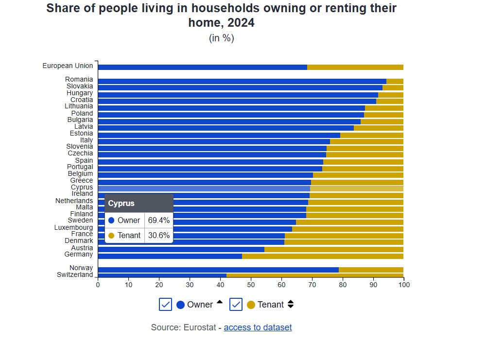 Η Κύπρος κινείται κοντά στον ευρωπαϊκό μέσο όρο, διατηρώντας υψηλά ποσοστά ιδιοκατοίκησης. Συγκεκριμένα, το 69,4% του πληθυσμού διαμένει σε δικό του σπίτι, ενώ το 30,6% ζει σε ενοίκιο, γεγονός που σημαίνει ότι σχεδόν επτά στους δέκα Κύπριους είναι ιδιοκτήτες της κατοικίας τους.