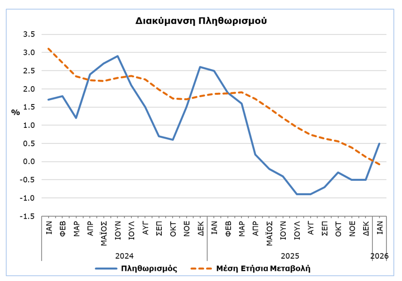 Συγκεκριμένα ο Δείκτης Τιμών Καταναλωτή τον Ιανουάριο 2026 μειώθηκε κατά 0,30 μονάδες και έφτασε στις 99,98 μονάδες σε σύγκριση με 100,28 μονάδες τον Δεκέμβριο 2025. Ο πληθωρισμός τον Ιανουάριο 2026 αυξήθηκε με ρυθμό 0,5%, προσθέτει η Στατιστική.
