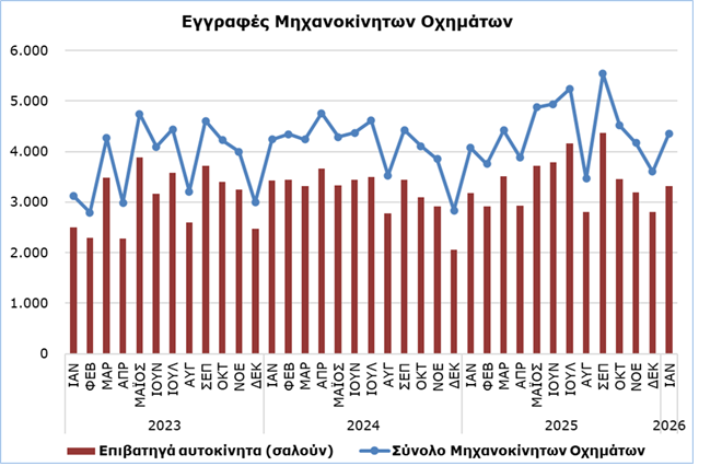 Ετήσια άνοδο σημείωσε ο συνολικός αριθμός των εγγραφέντων οχημάτων τον Ιανουάριο του 2026.